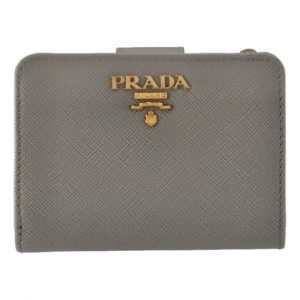 Prada Vitello Grain Argilla Grey Leather Small Wallet with Zipper Gold Plaque Logo