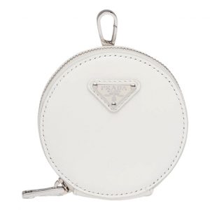 Prada Triangle Plaque Smooth White Leather Round Mini Pouch Keychain