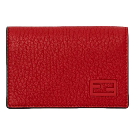 This Fendi leather card case wallet in fuoco red grained leather is a must have. A bold color choice, this luxe red leather wallet features the iconic FF logo on the bottom right and opens to reveal one main compartment and two card slots. Stay organized while on the go with this beautiful wallet from Fendi!