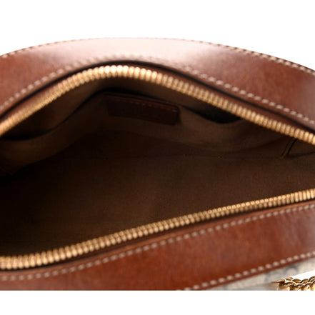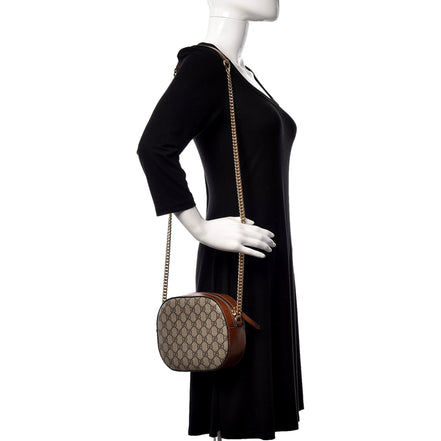 Compact, iconic, and effortlessly stylish, this Gucci GG Supreme Mini Oval Crossbody Bag is crafted in signature monogram canvas with rich brown leather trim. The sleek oval silhouette is paired with a refined chain and leather strap, creating a versatile designer piece perfect for day-to-night wear.