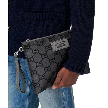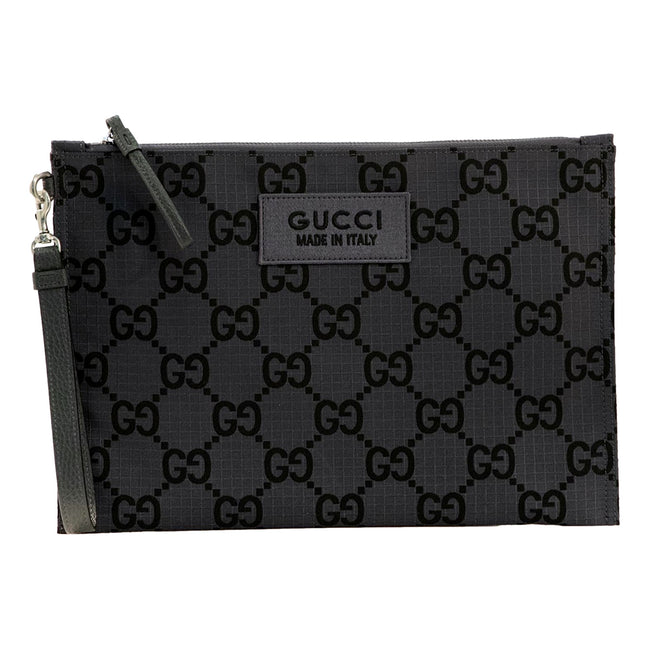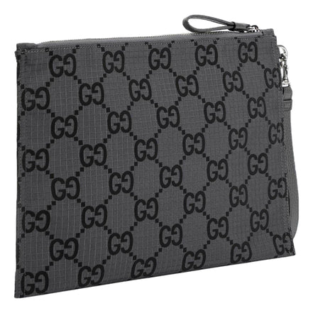 Authentic Gucci Ripstop Canvas Jumbo GG Large Clutch Wristlet crafted in durable gray and black technical ripstop canvas featuring the oversized Jumbo GG monogram pattern. This lightweight yet rugged designer pouch combines modern Gucci styling with practical everyday function.
