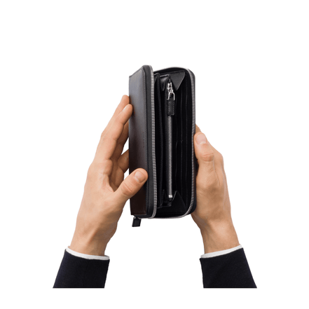 This continental wallet from Prada is crafted with black saffiano leather.  The front of this wallet features a black Prada logo. The silver-tone zipper opens to a black leather interior with multiple card and bill slots. This is the perfect wallet to keep your essentials close at hand!