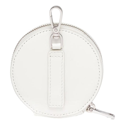 Elevate the style of your bag with this signature mini pouch keychain from Prada. This mini pouch keychain is crafted of shiny white leather and features the signature Prada triangle logo with silver-toned hardware. Perfect for storing small essentials such as earbuds, this chic and fashion-forward keychain adds a touch of luxury to your ensemble.