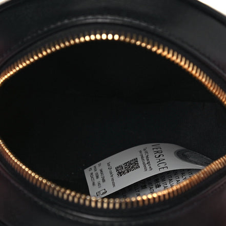 The Versace La Medusa Nappa Quilted Round Camera Shoulder Bag (Model 1002866) is a luxurious Italian-crafted piece in supple lambskin leather, featuring an elegant quilted design with polished gold hardware and a secure top zipper closure. This chic circular bag measures 7 x 2.5 x 7 and hangs from a chain strap with a 21 in. drop, while the interior is lined in sleek black fabric. It comes complete with authenticity cards and a Versace dust bag, making it the perfect blend of iconic Medusa elegance and everyday sophistication.