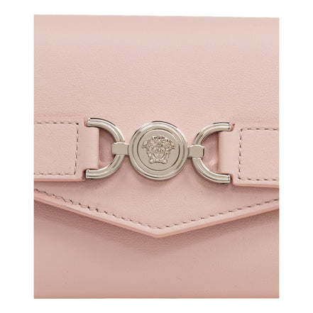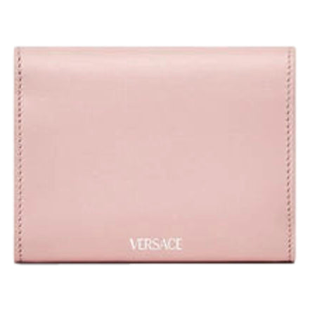 Take a look at the new, refined luxury at Versace! This light pink trifold wallet is adorned with a silver-tone Medusa embellishment and snaps open to reveal six card slots, a spacious bill compartment, and a handy zipper coin pouch. This wallet is perfect for the woman on the go! It seamlessly fits all your essentials with an added touch of designer luxury!